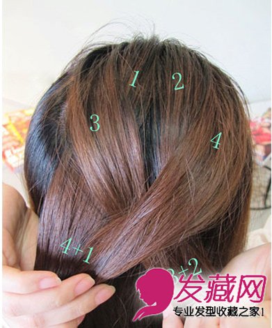 然后再从右边份的头发外侧取适量发束和左边份的头发加在一起