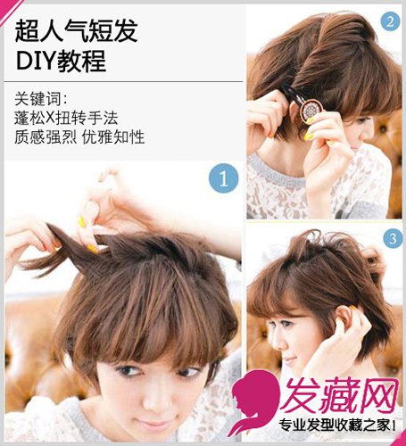 保留前额蓬松内卷的自然刘海,在距离刘海部位2厘米左右出选取右侧头顶一股发束,分成两部分呈螺旋状扭转编织至发尾。
