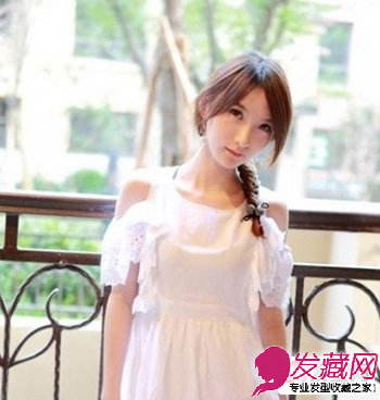 三七分的斜刘海修饰出小巧的瓜子脸,麻花辫用精美的发饰固定垂在肩上,简单大方,同时也很有淑女范哦!