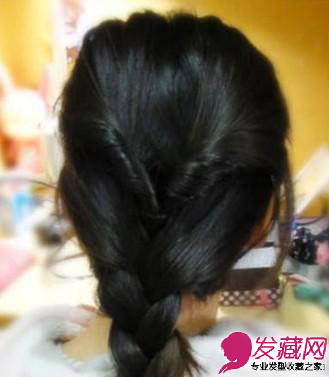 :现在我们将剩下的头发包在编好的头发上面,然后扎出一个大大的马尾辫,用皮筋将其固定,如图所示。