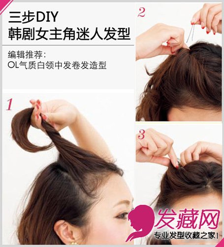 将所有卷发梳至脑后,分别在头顶靠近前额位置于左右两边抽取两股发束,同时由外向内进行扭转,做成自然内卷发样式。