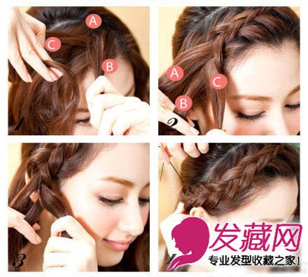 Step 1:先编反骨辫,A发束放在B下,C发束加股一起放在A下