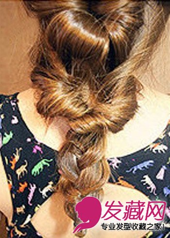 接着,将穿过来的头发,编成麻花辫的发型,用皮筋绑好。在绑最后一道的时候,不要将头发都拉出来。可以把辫子适合啦松些,如图