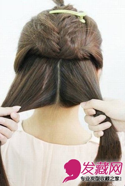 将第一款编好的鱼骨辫用夹子固定在头顶,然后将下面头发分成两份。
