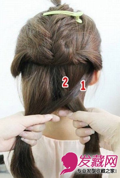 用鱼骨辫的方法进行编发,首先将右边最外层的发束1和发束2交叉,然后将发束1放到左手上。