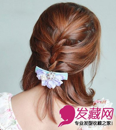 步骤7:在后颈顶处用橡皮筋固定,戴上发饰,这样就完成了