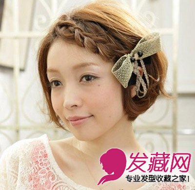 甜美的斜刘海短发编发,简单的在额前用侧分的刘海编出简单的麻花辫,再搭配上时下流行的蕾丝蝴蝶结发饰,整个造型不失甜美,又有看点,让你成为时下日本街头的可爱日系少女。