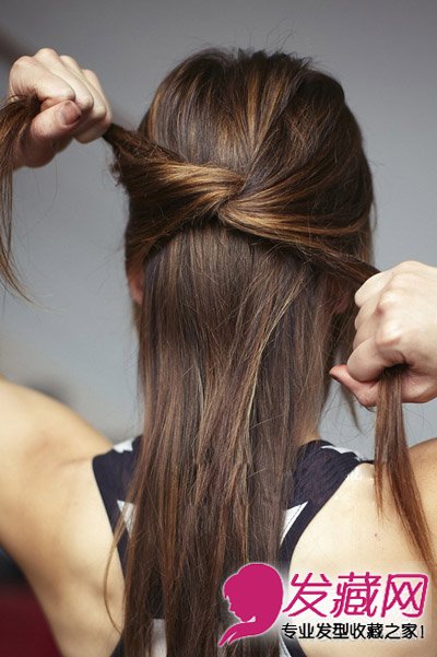 然后将两束头发在脑后方交叉,打一个简单的结,并稍稍拉紧;