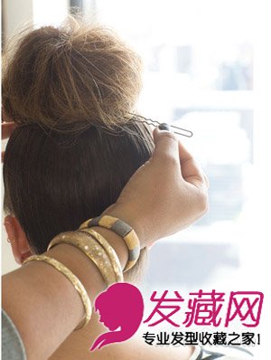 然后使用小发夹将发髻固定。由于之前已经将头发倒梳,所以你并不需要很多发夹来固定。让它呈现随意自然的蓬松状态即可。