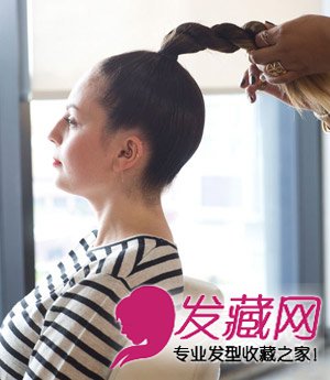 然后将发束分成两部分,简单地将两部分头发拧在一起编成麻花辫。接下来,将发胶涂在麻花辫上,抚顺上面的碎发。