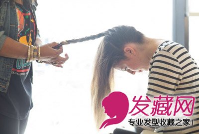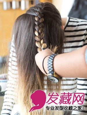 先低下头,并将所有头发拨到脸前。将头发以耳朵前侧为界,分成两部分。靠后的部分从颈背开始向前编出一个法国辫子。你可能需要找一个朋友来帮你完 成这部分造型!