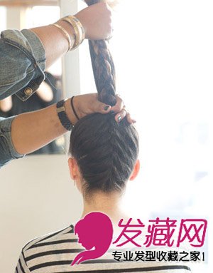 然后将所有的头发(包括刚刚编好的法国辫子)向上拉直,并在头顶扎成一个马尾。