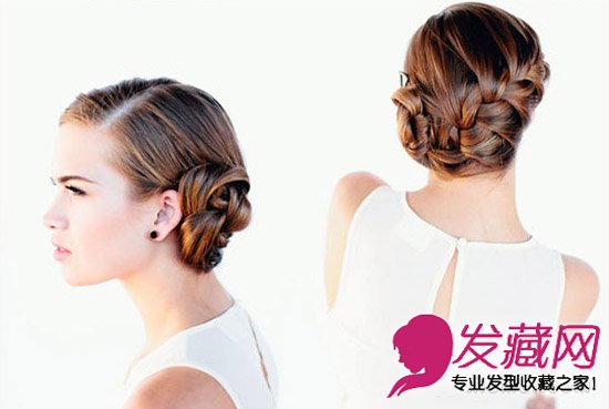Step8:卷动至左耳后,再用细长发夹固定花苞,最后完成编发。