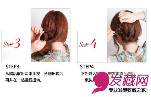 STEP4:重复上述步骤,将所有的发束都扭转后并和在一起,最后留出发尾,用发夹固定在头顶,完成编发。