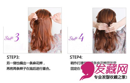 STEP3:右侧也编织出一条同样的麻花辫,再将两条辫子在脑后进行重合,并打理发辫。