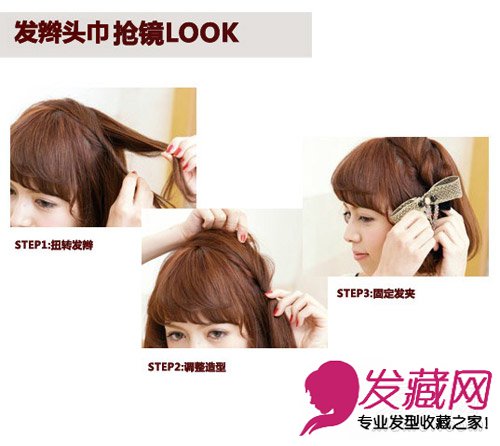 step1:留出刘海,沿着刘海取出一束头发,扭转后再取出另外一束头发并入。