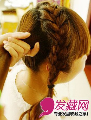 第四步:用编好的辫子缠绕马尾,形成一个低低的侧马尾,用发夹将辫子的尾稍固定一下。