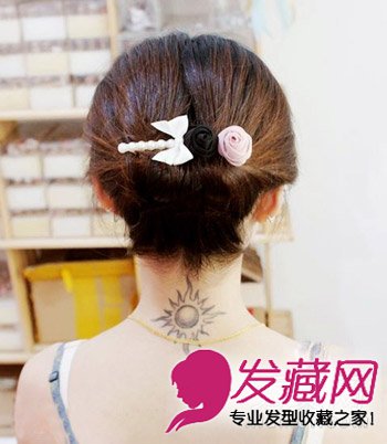 第四步:在脑后的缝隙上点缀一个好看的发夹,既美观又遮挡住了塞发的缝隙,这款发型就完成了。