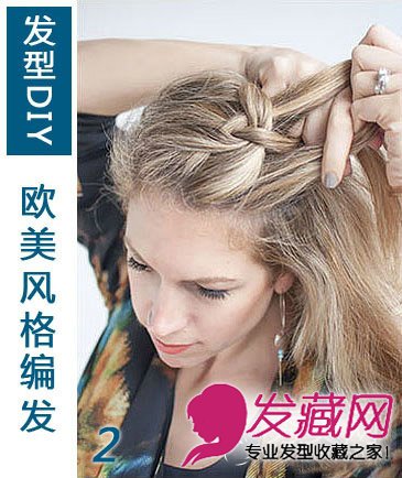 一边往头顶编发,一边在额头上方部分加入发束,使编发往斜向后发展。