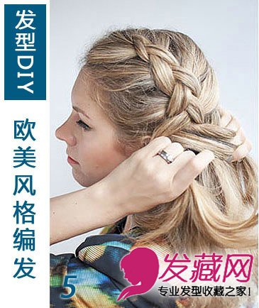 然后如刚开始的操作,耳上太阳穴之间的头发亦不断加入编发中,并将右侧的头发跨过后脑一束一束加入编发。