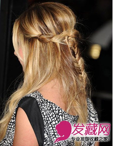 从头发两边分别取两缕头发梳成麻花辫的方式很久以前就有,不过这款发辫的特别之处就在于这两缕头发经过拧结再做成鱼骨辫,让造型更有细节。