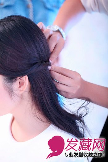 step2:从左耳上方将刘海露出至脑后扭转几圈。