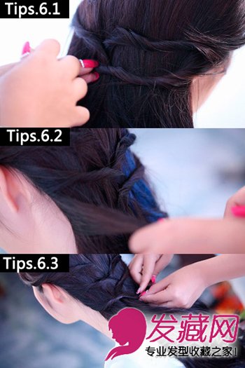 step6:再从右侧取出第二束头发,同样扭转后用发夹固定在脑后,并以左-右-左-右的顺序轮流扭转发辫,扭转到最后就完成了这款编发造型。