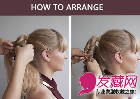 step1:将头发绑成适当的马尾,再将头发分成上下两部分。上部分头发分成三股。