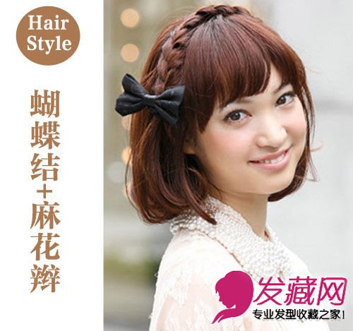 沿着刘海编织出一条紧致的麻花辫子,再加上一个蝴蝶结点缀,让你魅力不可挡。而且碎碎的斜刘海非常修颜哦。