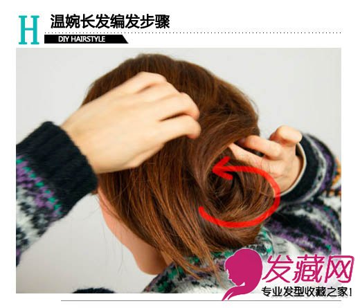 step6:如图示一般,逆时针缠绕发束,盘起长发。