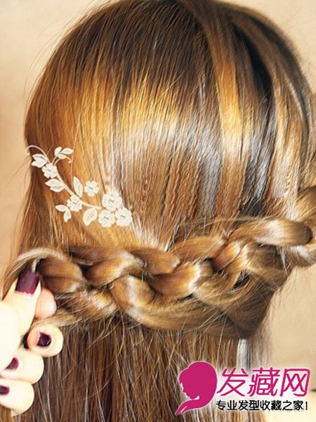 这样一直编,把右边的头发编到耳际处以后,再把头发横过向左编来编,如图