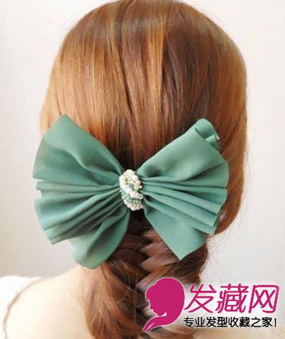 7、最后在编发开始处加入一个大大的蝴蝶结发饰,就这样简单的鱼骨辫编发完工了,是不是看起来相当优雅清爽呢?小编也忍不住要赞一个哦!
