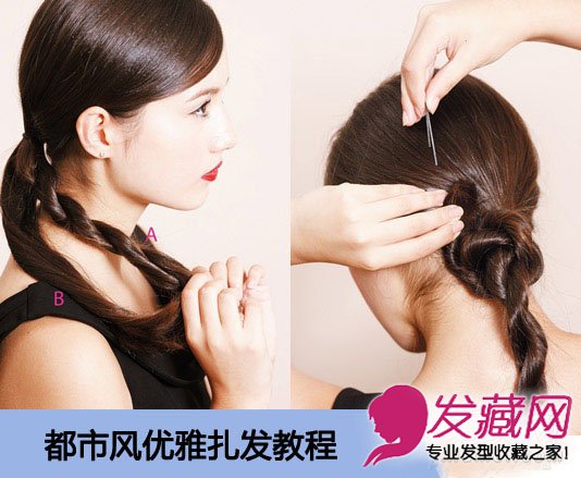 step4:拉扯B发束,缠绕发尾扭转成花苞状,发尾用发夹固定在头顶。