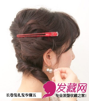 step5:取出剩下的头发,拉扯到右侧扭转,发根处别上发夹。