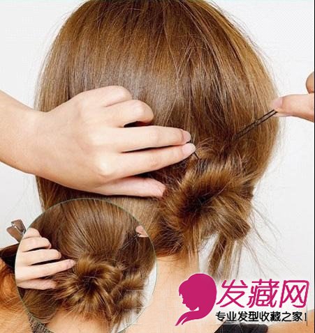 4.在左耳后方处,顺时针拧转盘旋发股,使用发卡固定。剩余两股发束,如同上方,拧转后盘旋固定。