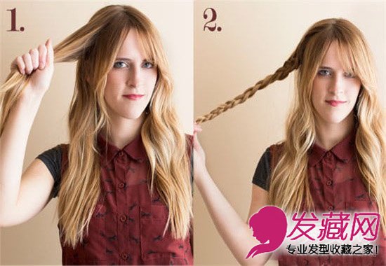 STEP 1 首先把头发洗干净吹干,把头发打理柔顺再均匀分成两半,然后在右边抽取一小部分头发并编成麻花辫,用细橡皮筋固定。