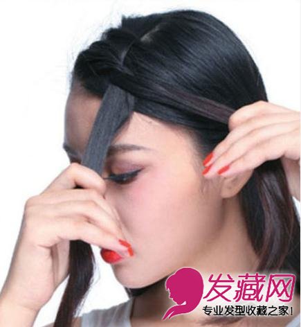 step2:将发量较多的这边,从分界线开始抓出一小束头发,再分成两部分,接着用扭麻花的方式扭转头发,切忌麻花拧的太紧以免影响下面的步骤。