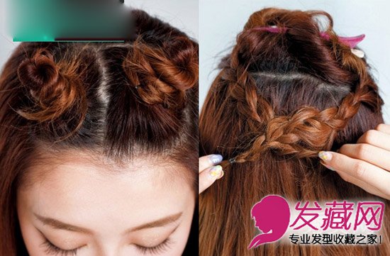 STEP1>>从中间将前发分开。两侧分别选取至太阳穴位置的发束,从后向方内侧尽量拧转紧一些。