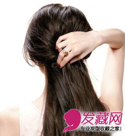首先用手指将头发随意分成上下两部分,挑出上面的头发汇集于脑后中央。