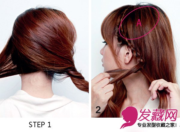 step2.将头顶区A的发根用尖尾梳倒梳打毛,从右耳上方起沿刘海分界线,不断取发片,做单层叠加三股续辫,余下头发用卷棒做平内卷。