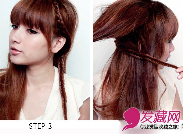 step4.将三股辫沿头顶与刘海分区线,包裹头顶线环绕一圈,形成简单的发带,用小竖夹固定,余下头发自然散落即可。