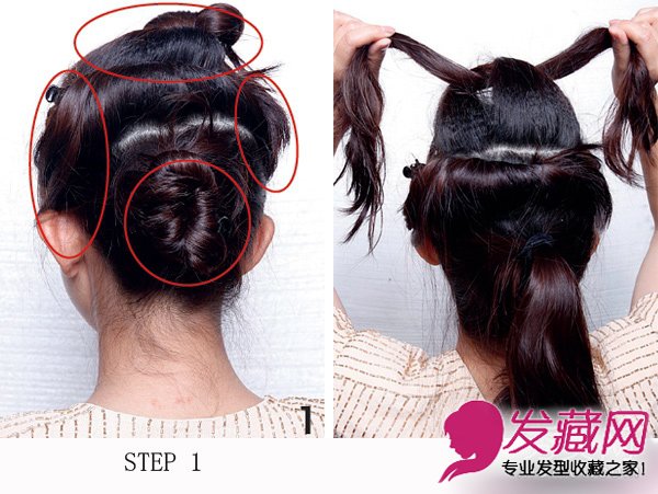 step2.把头顶U区的头发从中间分成左右两部分,双手两次轻轻交叉打结,形成死扣,头顶的头发会有自然的蓬松感。