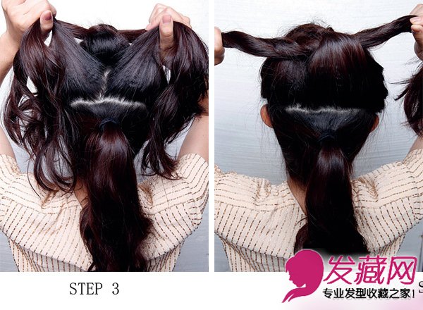 step3.中间倒梯形区也从中间分成左右两部分,左右分别和头顶U区交叉打结后的发尾叠加,形成两股。