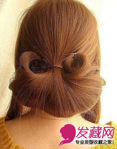 3、接着把发尾内扣式往上卷出花苞发髻,并使用夹子固定好。