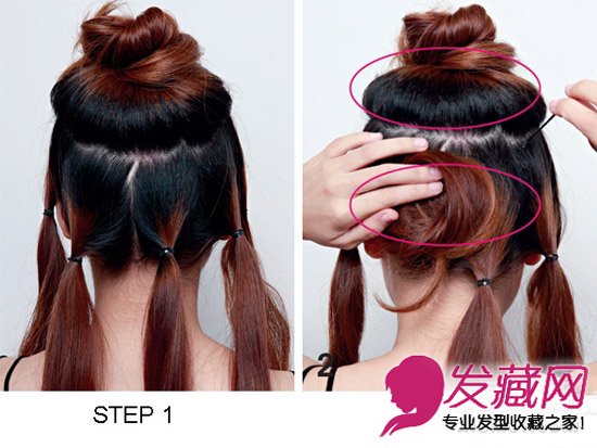 step1.如图,将头发分为头顶区和下半区,再将下半区平均分为四个区,分别用小发圈固定。