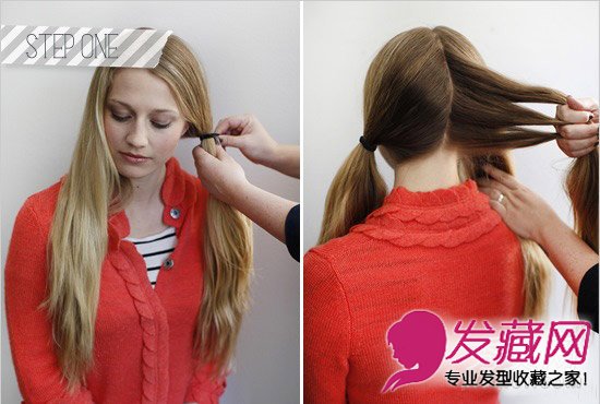 STEP1. 首先,把头发梳理柔顺,注意不允许有打结现象,把头发均匀的分成两部分分别放在双肩上,然后再用小发圈固定好。