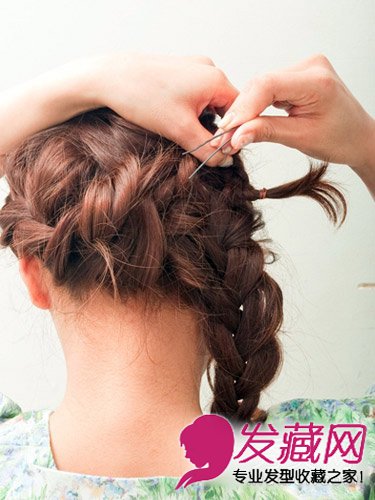 step7:将左侧的发辫拉扯到右方用发夹固定起来。