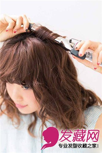 将剩余的头发分为表层和内侧后,内侧发丝从中央位置开始朝前后随意卷烫,表层发丝则从根部开始卷烫。