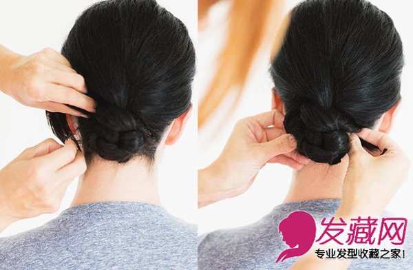 5.还剩下另外一股头发,怎么处理它呢?将其在发髻下面缠绕住发包 (绕在外面也可以,随个人习惯而定) ,固定好。