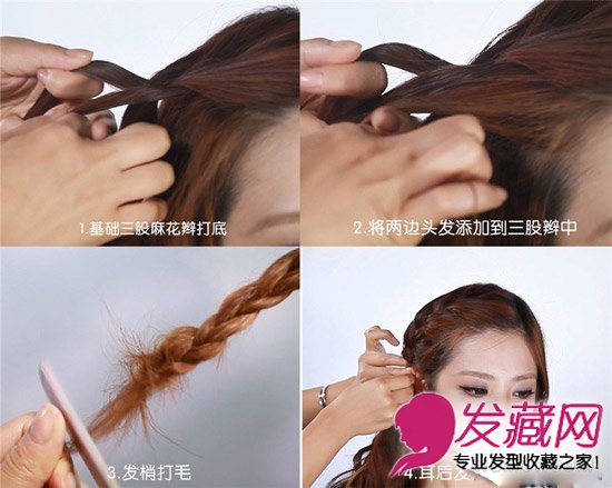 首先基础麻花辫打底,然后将两边的头发添加到三股辫中;将发梢打毛,最后在耳边固定。